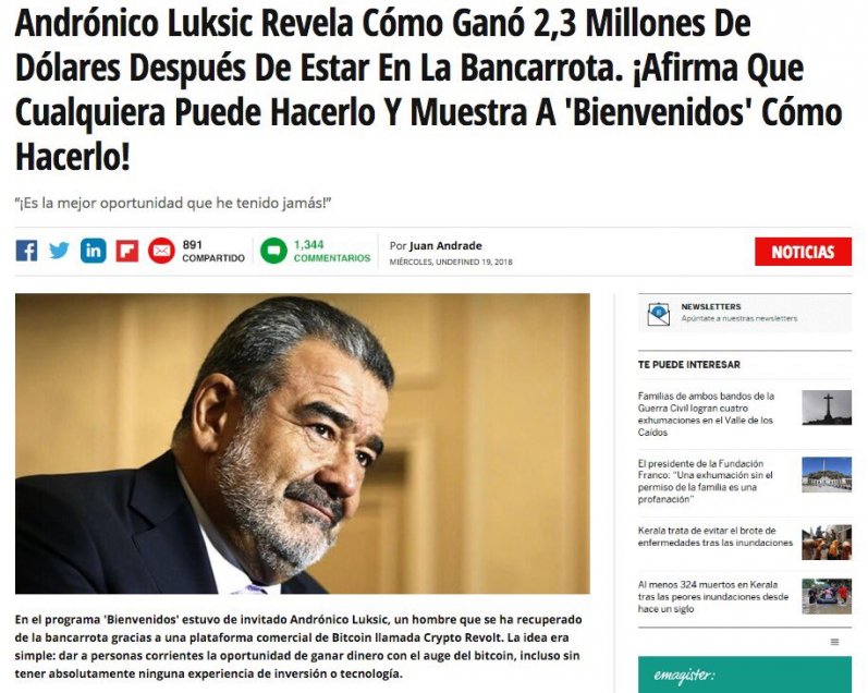 El empresario Andrónico Luksic denunció en su cuenta de Twitter que alguien está usando su imagen con fines comerciales, tal como acusó Iván Zamorano. El magnate dijo que "esto es totalmente falso!!! No he dado esa entrevista, no he ido jamás a Bienvenidos, no he invertido jamás en bitcoins y jamás recomendaría una inversión como esa, mucho menos en una plataforma así Por favor no se dejen engañar! Es totalmente falso !! Fake news!"