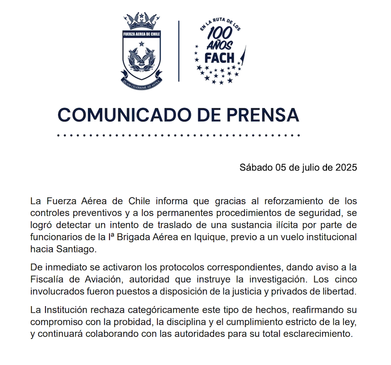 Funcionarios de la Iª Brigada Aérea en Iquique fueron sorprendidos durante los controles preventivos previos al viaje, que tenía como destino la Región Metropolitana.