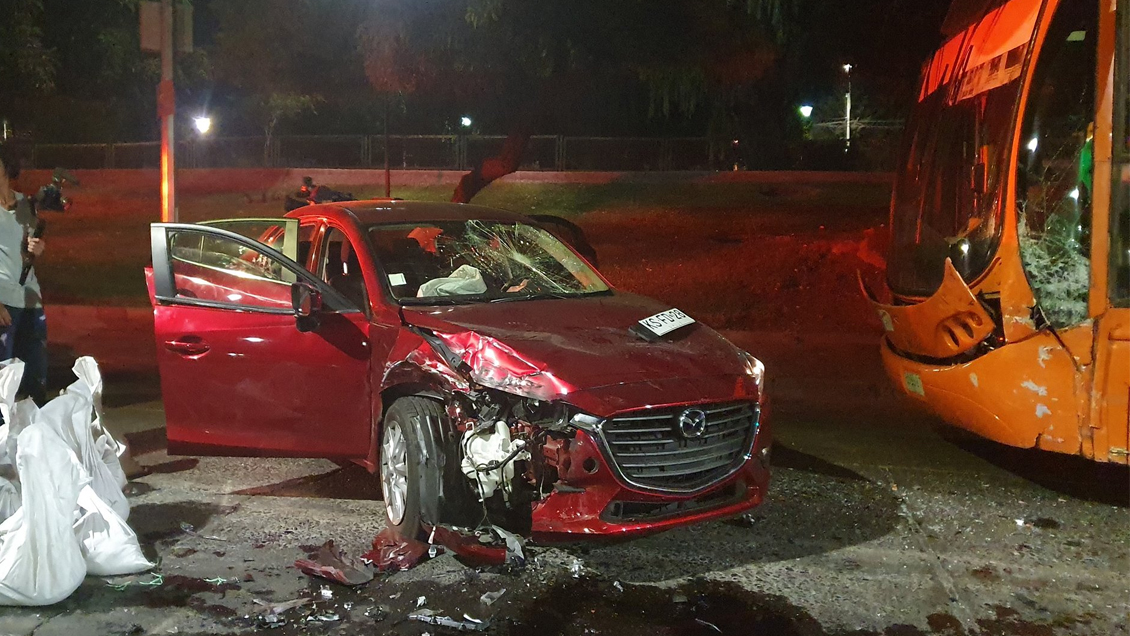 La carrera terminó en la esquina de Tobalaba con José Arrieta, en la comuna de Peñalolén, donde "se logra dar alcance a estos sujetos cuando chocan de frente contra un microbús (del Transantiago) que se encontraba estacionado en una de las pistas, resultando dos delincuentes lesionados" y detenidos, indicó Carabineros.