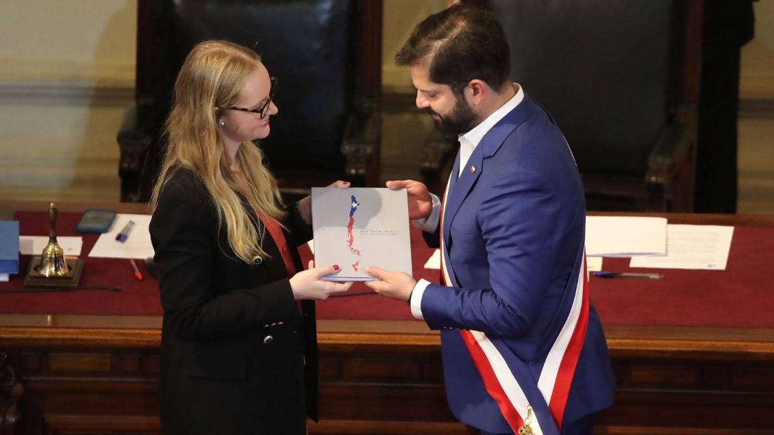 | El Presidente Gabriel Boric recibió de manos de Beatriz Hevia el texto final redactado por el Consejo Constitucional