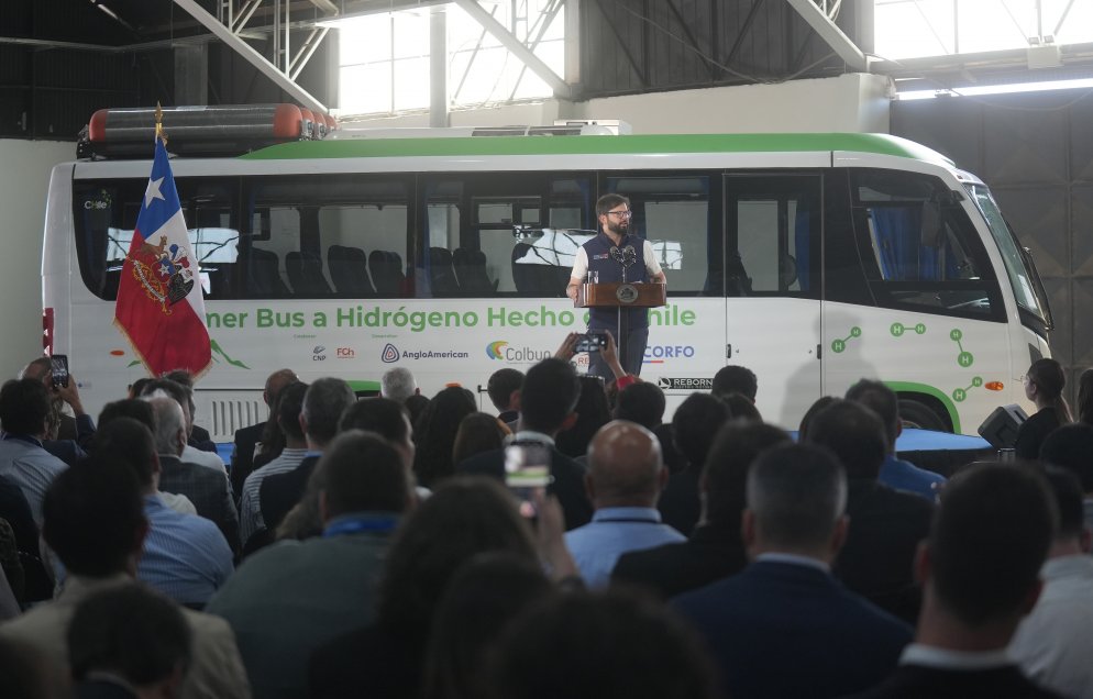 El Presidente Gabriel Boric participó este miércoles en el lanzamiento del primer bus hecho en Chile que funcionará con hidrógeno verde como combustible.