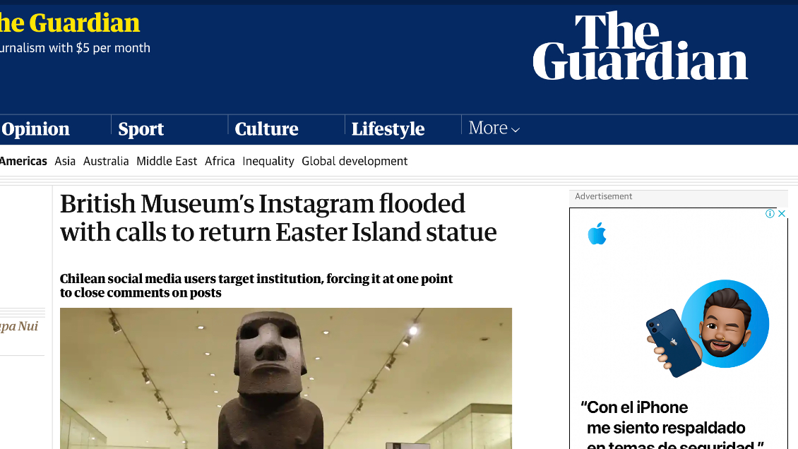 "La campaña en línea comenzó después de que el influencer Mike Milfort, radicado en Santiago, alentara a su millón de seguidores a usar sus teclados y exigir que el museo devolviera los monolitos (...) generando una tendencia de hashtag que llegó hasta el presidente Gabriel Boric, quien expresó su apoyo durante una entrevista en la radio chilena", explicó el medio inglés.