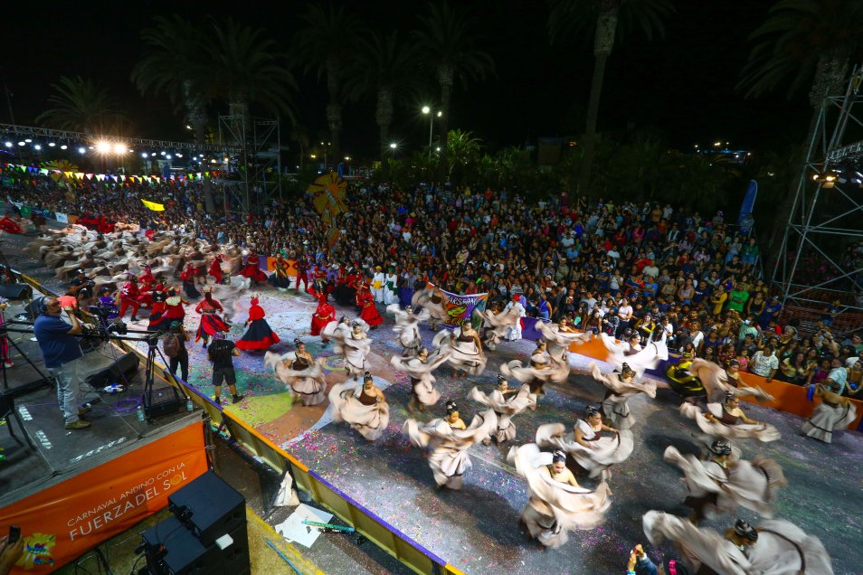 Este viernes comenzó una nueva versión del Carnaval Andino con la Fuerza del Sol en la ciudad de Arica, donde después de dos años de suspensión por el Covid-19 más de 16 mil bailarines en 68 comparsas de Chile, Perú, Bolivia y Argentina volverán a danzar en un circuito de dos kilómetros que recorre el centro de la ciudad. Se espera la llegada de 150 mil espectadores y el evento culminará este domingo en el Morro de Arica.