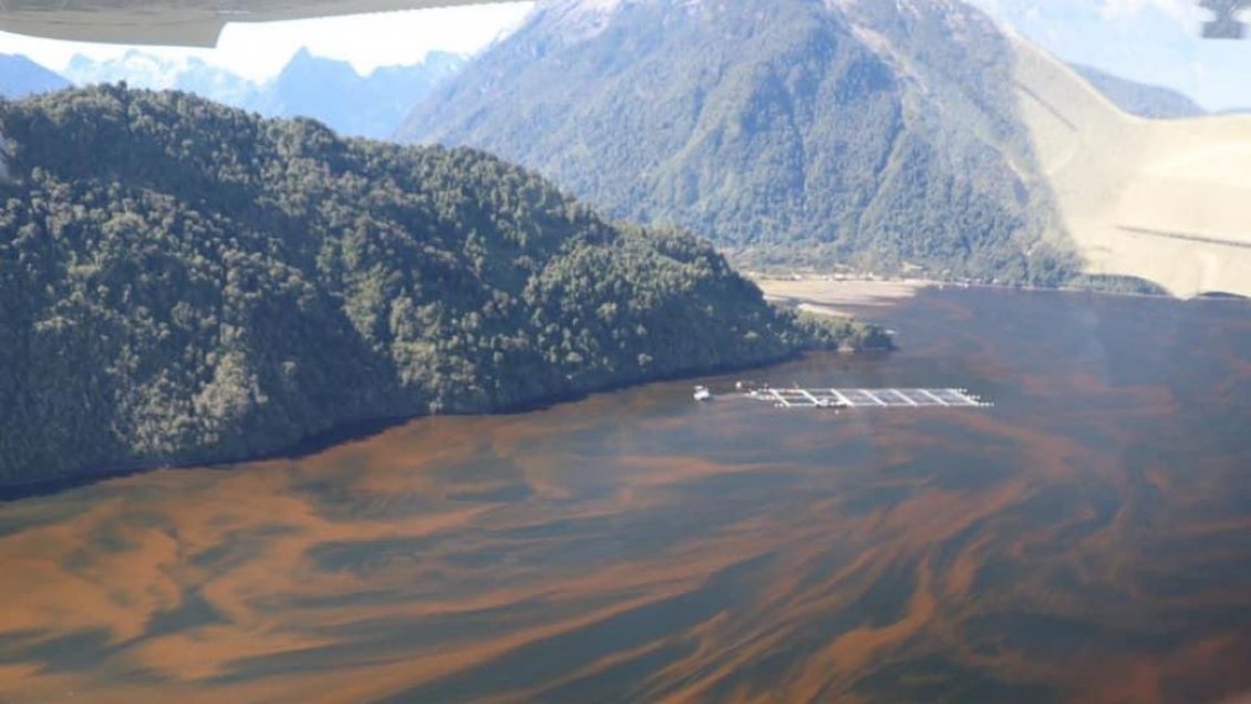 Un sobrevuelo por el fiordo Comau, en la Región de Los Lagos, permitió apreciar la magnitud del fenómeno.