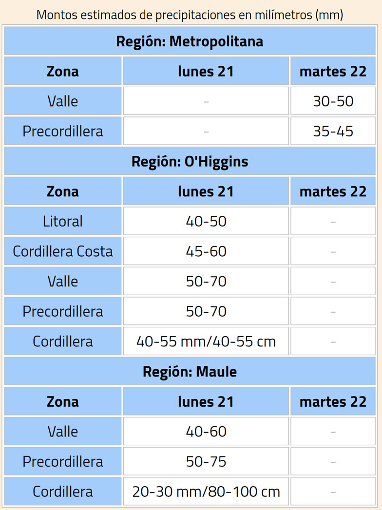 Por el nuevo sistema, el pronóstico apunta precipitaciones "normales a moderadas" entre Valparaíso y Biobío. Sin embargo, entre la Región Metropolitana y la del Maule se esperan lluvias "moderadas a fuertes", con la caída de hasta 50 mm en el valle capitalino y 100 mm en la cordillera maulina.