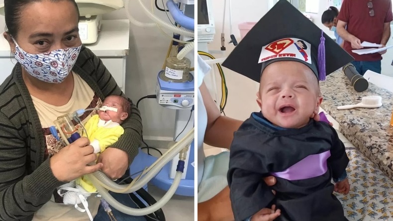 El pequeño Kelvin Barbosa Lima nació pesando apenas 620 gramos en un hospital de São Paulo, Brasil, donde estuvo internado durante más de cuatro meses hasta hace pocos días, cuando le dieron el alta para ir a casa con su familia. El bebé prematuro (nació a los seis meses de gestación) se fue homenajeado, con una ceremonia tipo graduación, incluyendo sombrero, diploma y toga. "Era muy chiquito. El médico decía que le era imposible sobrevivir", dijo su mamá a G1 y destacó la labor del personal de salud que siempre le dio fuerzas para seguir.