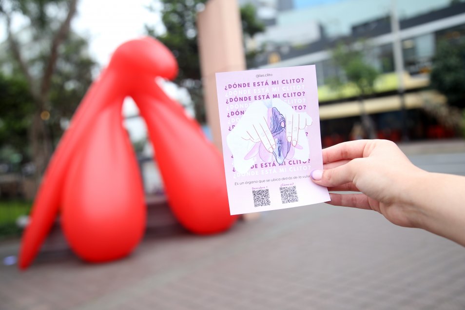 El colectivo Las Clito y sexólogas chilenas instalaron un clítoris inflable de tres mestros -obra de la artista francesa Julia Pietri- en el Óvalo de Miraflores, en Lima, para visibilizar "el derecho al placer".