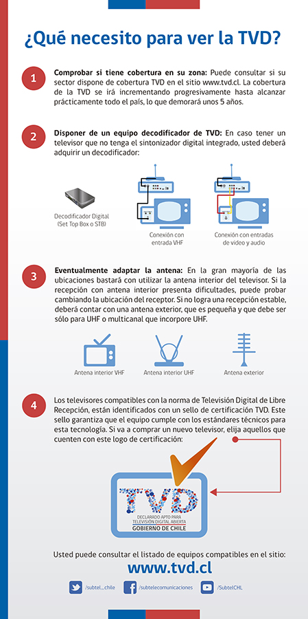 Quienes posean un televisor con sintonizador digital (logo TVD en el aparato) podrán sintonizar libremente, por aire, la señal HD de TVN. Y quienes posean una TV convencional o sin sintonizador digital incorporado, deberán instalar un decodificador TVD y una antena VHF para captar la señal.