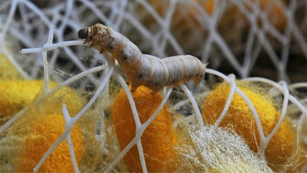Un gusano de seda arrastrándose en un museo de seda, en la villa de Jili de la ciudad de Huzhou, provincia de Zhejiang. (Xinhua)