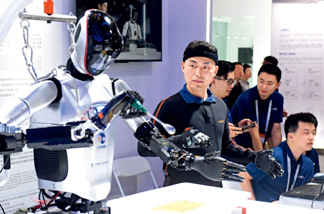 Un trabajador muestra el funcionamiento de un robot controlado por gestos. Ese día se inauguró en Shanghai la Conferencia Mundial de Inteligencia Artificial (IA) y la Reunión de Alto Nivel sobre la Gobernanza Mundial de la IA. (Xinhua)