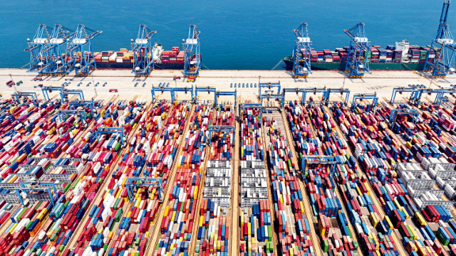 Buques en la terminal de contenedores automatizada del puerto de Qingdao, provincia de Shandong. (Xinhua)