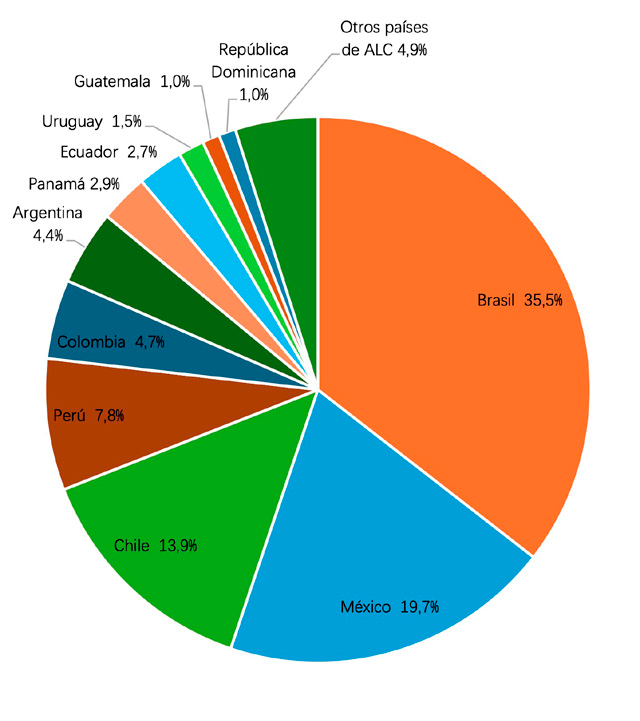 México, el único país de ALC situado geográficamente en América del Norte, mantiene amplios y profundos vínculos económicos con Estados Unidos. En los últimos 10 años, el volumen del comercio bilateral entre China y México, y su proporción dentro del comercio entre China y ALC, ha logrado un rápido crecimiento. Otros países cuyo comercio bilateral fue superior o igual al 1 % del comercio entre China y ALC en 2022 fueron Perú (7,8 %), Colombia (4,7 %), Argentina (4,4 %), Panamá (2,9 %), Ecuador (2,7 %), Uruguay (1,5 %), Guatemala (1,0 %) y la República Dominicana (1,0 %).
