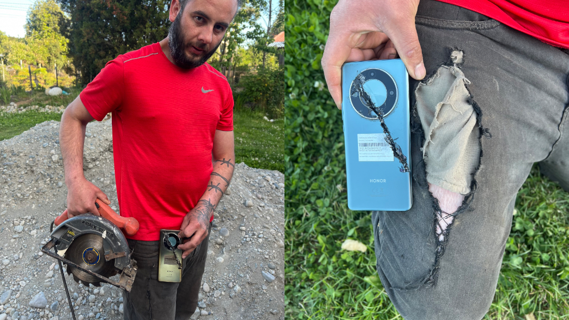 "El pantalón que ahora uso como mi regalón quedó entero rajado, mientras que el celular también se rompió, pero se trata de un equipo ultra resistente, que de no haberlo tenido ahí, la sierra hubiera pasado cortando la pierna de forma bien profunda", rememora Pedro quien justamente había comprado este teléfono HONOR por su resistencia.