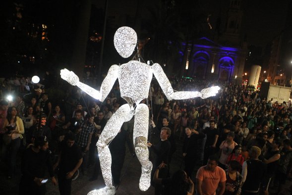 En pleno centro de la capital, el espectacular pasacalle alemán "Dundú - Luz de vida", una marioneta gigante e iluminada, acompañada de el nuevo Dundu y el Dundu Chiquito—, asombró a quienes la noche de este sábado visitaban la Plaza de Armas de Santiago en uno de los últimos grandes espectáculos de Santiago a Mil.
