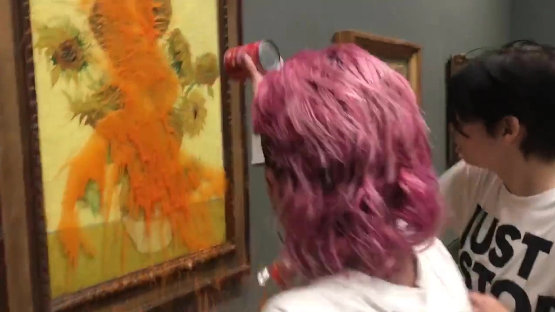 Los manifestantes, vestidos con camisetas con el nombre de esa organización, arrojaron dos latas de sopa de tomate de la conocida marca Heinz sobre la obra pintada en 1888, antes de arrodillarse frente a la pintura y pegar sus manos a la pared bajo ella.