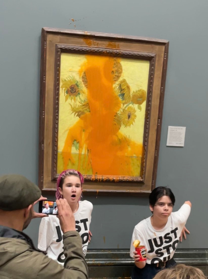 Activists with @JustStop_Oil have thrown tomato soup on Van Gogh’s Sunflowers at the national Gallery and glued themselves to the wall. pic.twitter.com/M8YP1LPTOU
