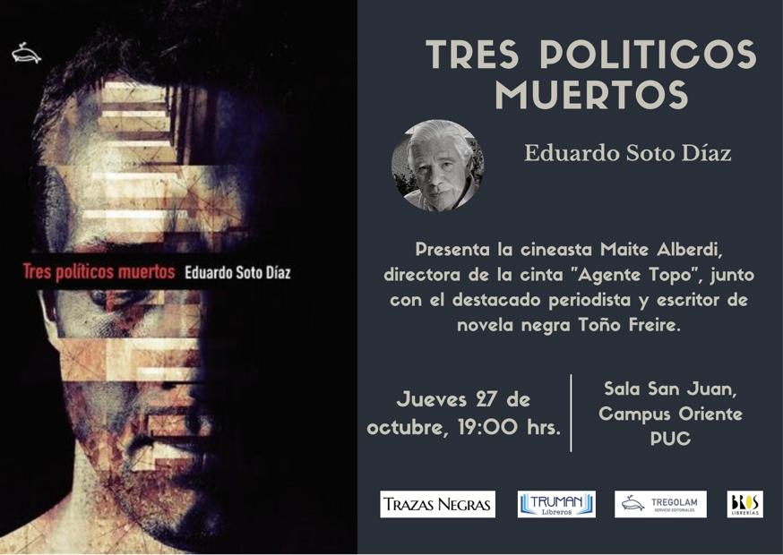 "Tres políticos muertos" es la nueva novela de género negro escrita por Eduardo Soto Díaz, una obra con un ritmo infatigable que será presentada por su autor este jueves 27 de octubre en la Sala San Juan del Campus Oriente de la Pontificia U. Católica de Chile (PUC), en un evento que contará con la presencia de Maite Alberdi, directora nominada al Oscar por "El agente topo".