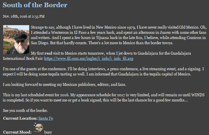 En el marco de la Feria Internacional del Libro de Guadalajara, el escritor dijo que "esta es mi última actividad agendada para este 2016. Mi lista de apariciones públicas en 2017 es muy limitada y permanecerá así hasta que 'Vientos de Invierno' esté completo".