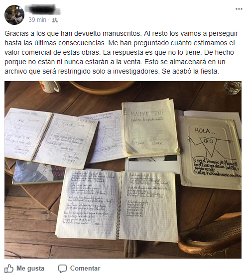 "Gracias a los que han devuelto manuscritos. Al resto los vamos a perseguir hasta las últimas consecuencias", escribió el músico junto a una fotografía de los cuadernos recuperados.