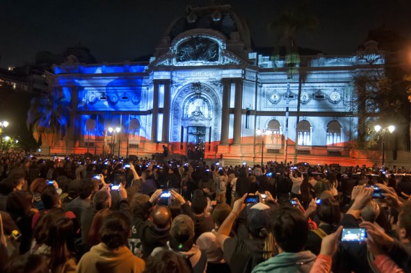 Este miércoles se inauguró Küzefest, festival de luz de Santiago, con el Mapping Challenge Latinoamérica, donde juegos de luces, imágenes multicolores y audio se fundieron en una propuesta artística audiovisual que iluminó el renovado frontis del Museo Nacional de Bellas Artes.