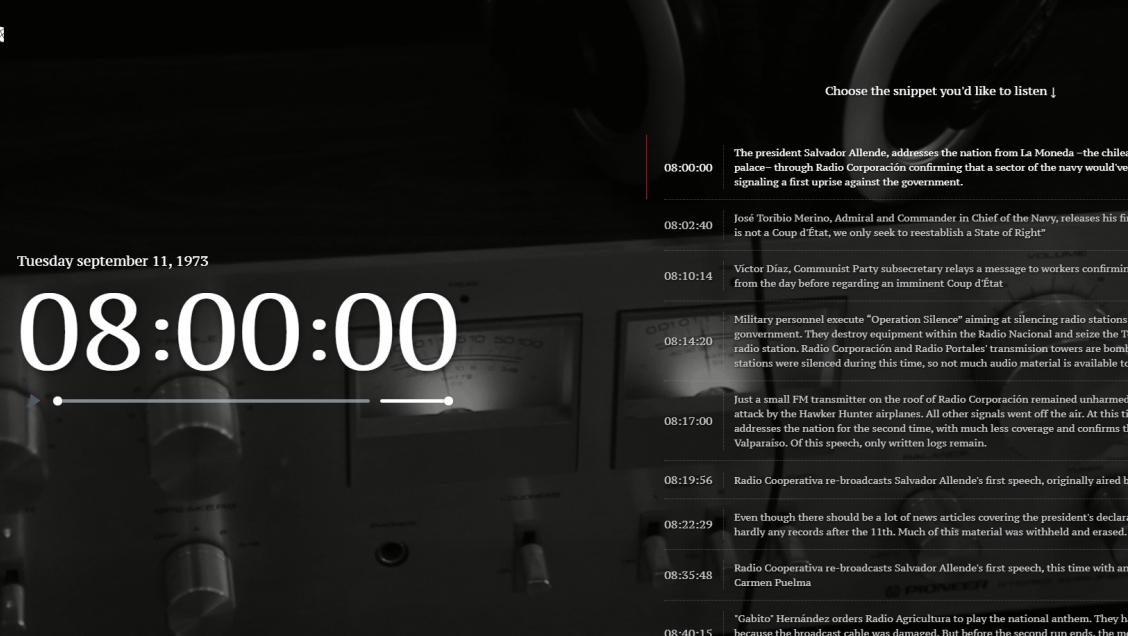 La campaña, desarrollada junto a la agencia Wolf BCPP, se realizó en el marco de la conmemoración de los 45 años del golpe de Estado en Chile, una galería auditiva en tiempo real tuvo como propósito reconstruir los episodios que marcaron el 11 de septiembre de 1973.