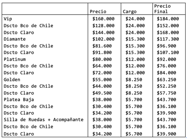El turno de Chile tendrá 11 funciones, que se desarrollarán entre el 23 de agosto al 1 de septiembre en el recinto de Parque O'Higgins. La venta de entradas tendrá una fase exclusiva para clientes Banco de Chile entre el 15 y 17 de abril. Desde el 18 de abril al mediodía habrá una venta para clientes Claro.