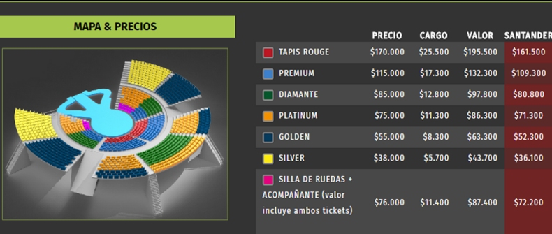 Los boletos se pueden adquirir a través del sistema Puntoticket con valores que van de los 38.000 a los 170.000 pesos, más cargos por servicios.