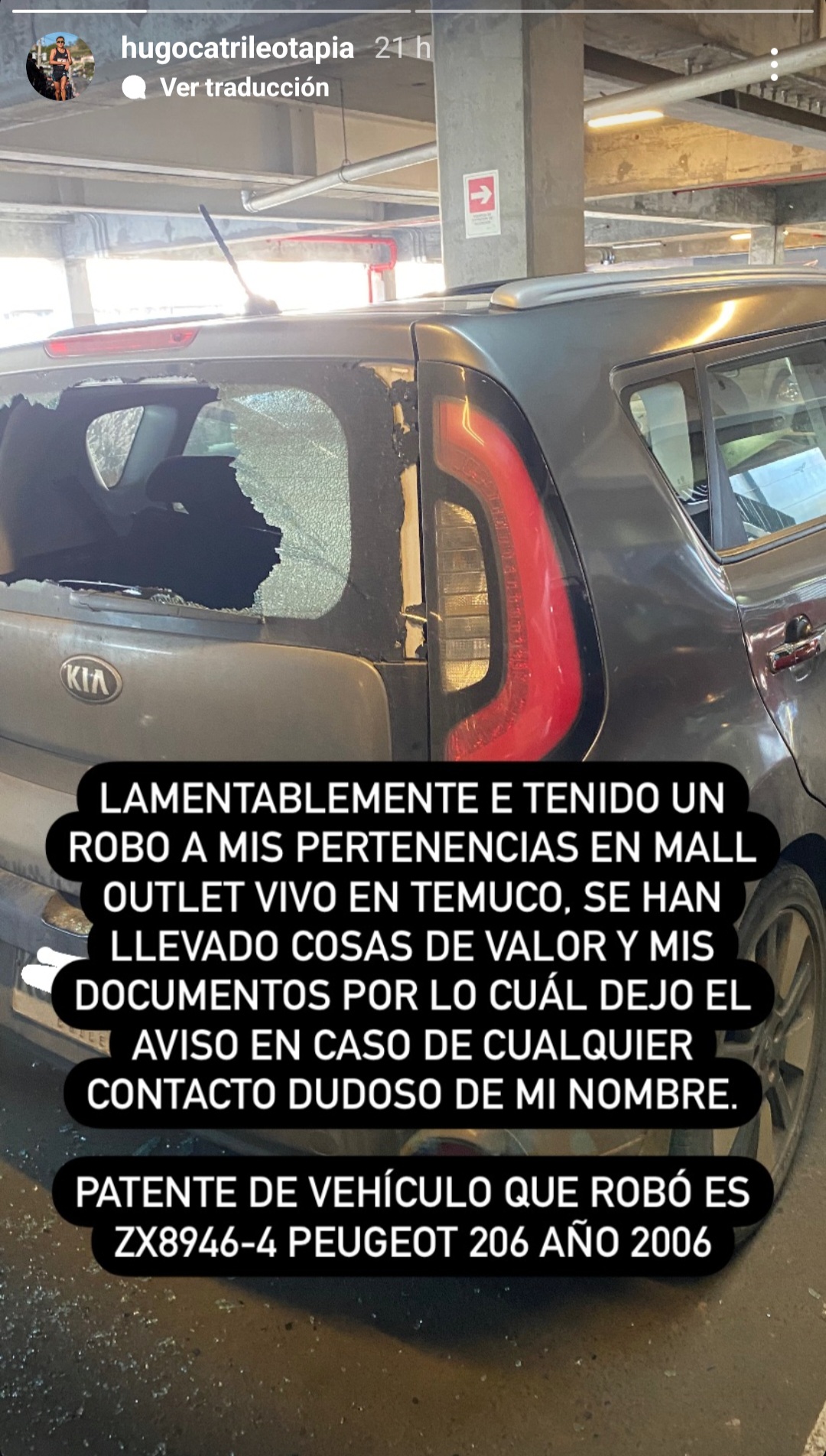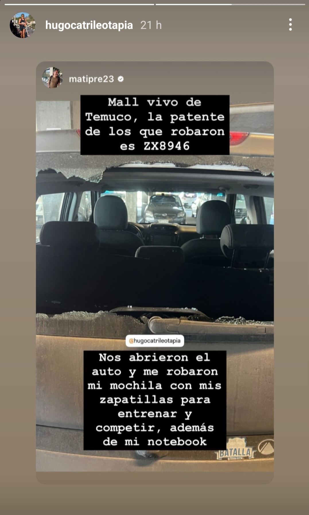 Fue el propio atleta quien denunció el hecho por redes sociales. Los delincuentes rompieron el cristal trasero de su vehículo en el estacionamiento del Mall Outlet Vivo, para llevarse zapatillas, ropa y los documentos del deportista.
