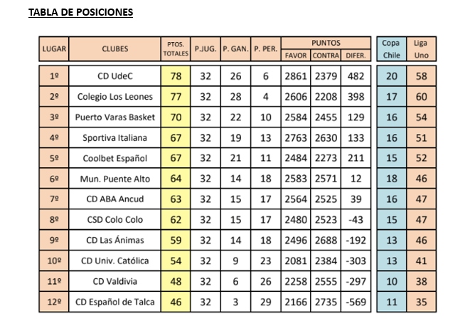 En tanto, Puerto Varas Basket se quedó con el tercer puesto de la tabla de posiciones, tras sus triunfos como local sobre Colo Colo, Municipal Puente Alto y Municipal Español de Talca, y enfrentará en play-offs a Municipal Puente Alto, que se confirmó como el sexto clasificado, tras un trabajado triunfo como visitante sobre el Club Deportivo Valdivia, por 71-76.
