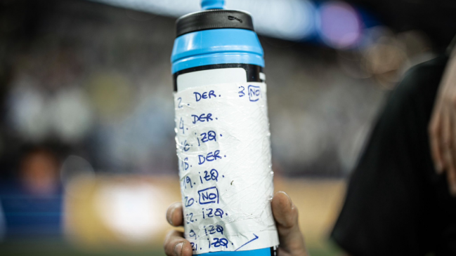 Durante la última arenga previa a la tanda, el arquero Sergio Rochet recibió una botella con indicaciones según el pateador, ordenados por número de camiseta para identificarlos rápidamente.