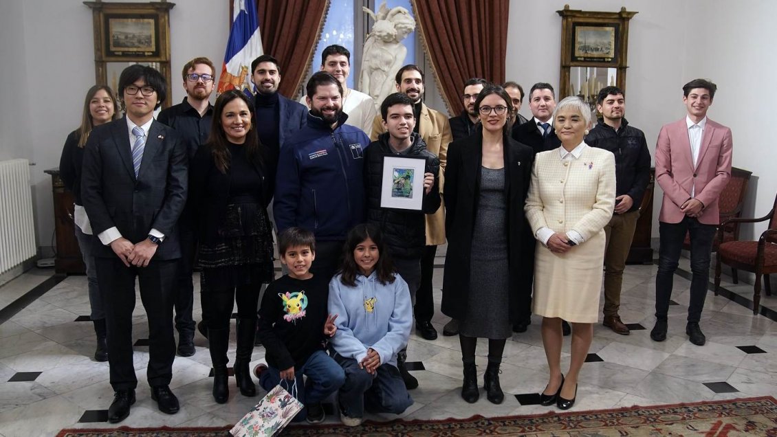 El Mandatario junto ministra vocera Camila Vallejo, la subsecretaria de Relaciones Exteriores, Gloria de la Fuente, y la embajadora de Japón, Ito Takako, recibieron al joven de 18 años junto a los otros ocho jugadores chilenos que participaron del Torneo Mundial de Pokémon, celebrado en Honolulu, Hawaii.