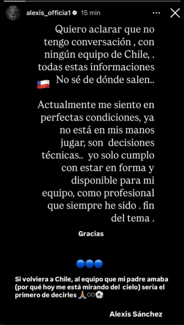 "Quiero aclarar que no tengo conversación con ningún equipo de Chile. Todas estas informaciones no sé de dónde salen", publicó Alexis en sus historias de Instagram.