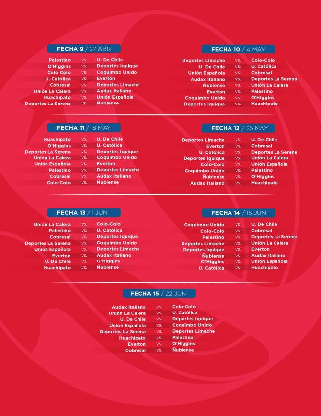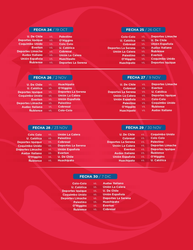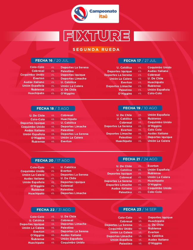 De acuerdo a la ANFP, la segunda rueda será espejada, es decir, se juega en el mismo orden, pero los equipos invierten la localía, y se espera que se cierre el torneo el 7 de diciembre.