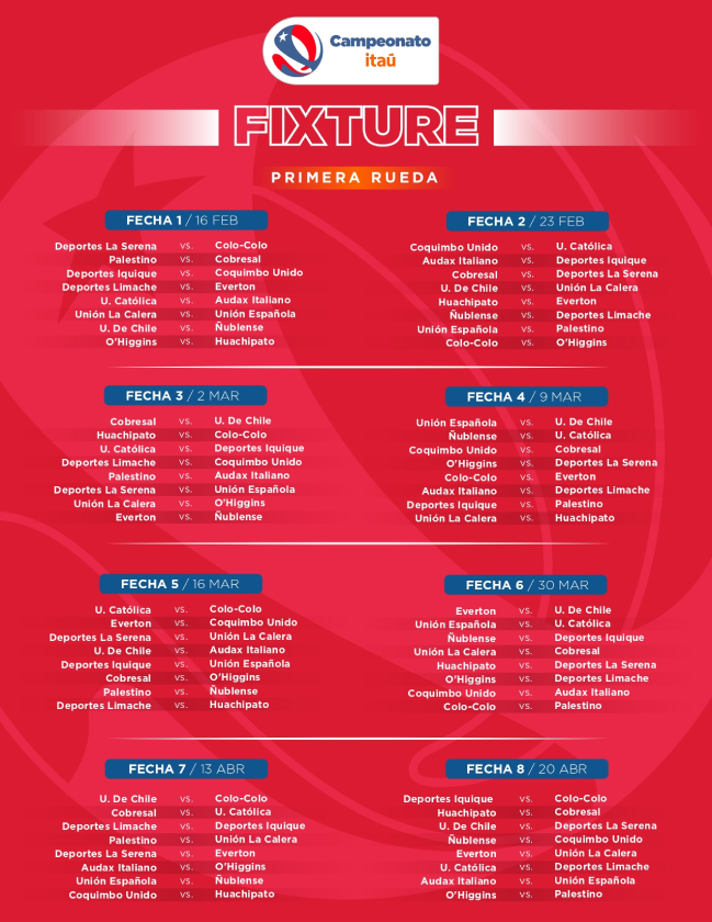 La ANFP dio a conocer este lunes 20 de enero el fixture completo del Campeonato Nacional 2025, que arrancará el fin de semana del 16 de febrero y se extenderá hasta diciembre.