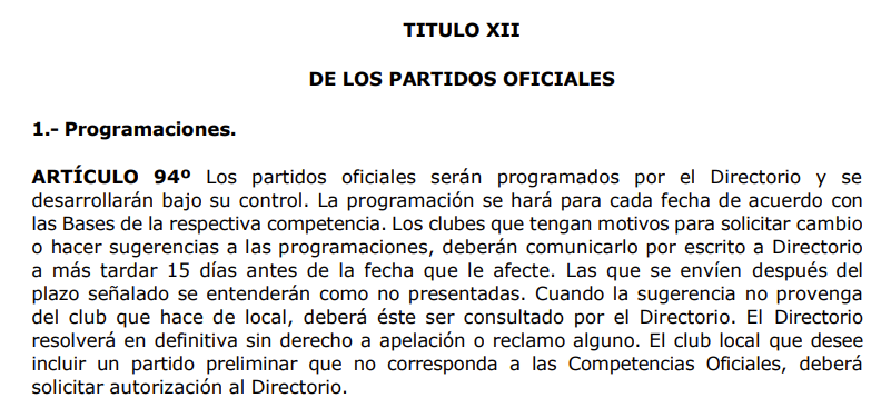 Sin embargo, el reglamento de la ANFP complica la solicitud calerana. Si bien las bases del Campeonato como tal no muestran impedimentos, el Artículo 94 del régimen de la Asociación -vigente desde junio- indica que cualquier solicitud de cambio de programación por parte de los clubes "deberán comunicarlo a más tardar 15 días antes de la fecha que le afecte", condición que en este caso no se cumple.