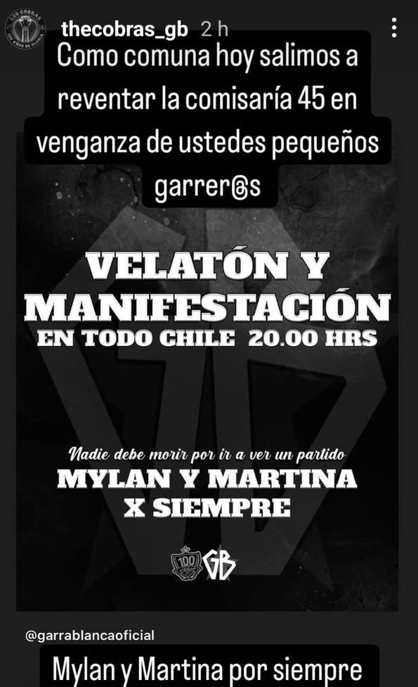 La Garra Blanca instó a realizar una velatón a nivel nacional, pero mensajes en redes sociales vinculados a la barra también llamaron a "reventar" la 45ª Comisaría de Cerro Navia, donde cumplía funciones el carabinero que actualmente figura como imputado en la investigación, y que actualmente está apartado de sus labores operativas.