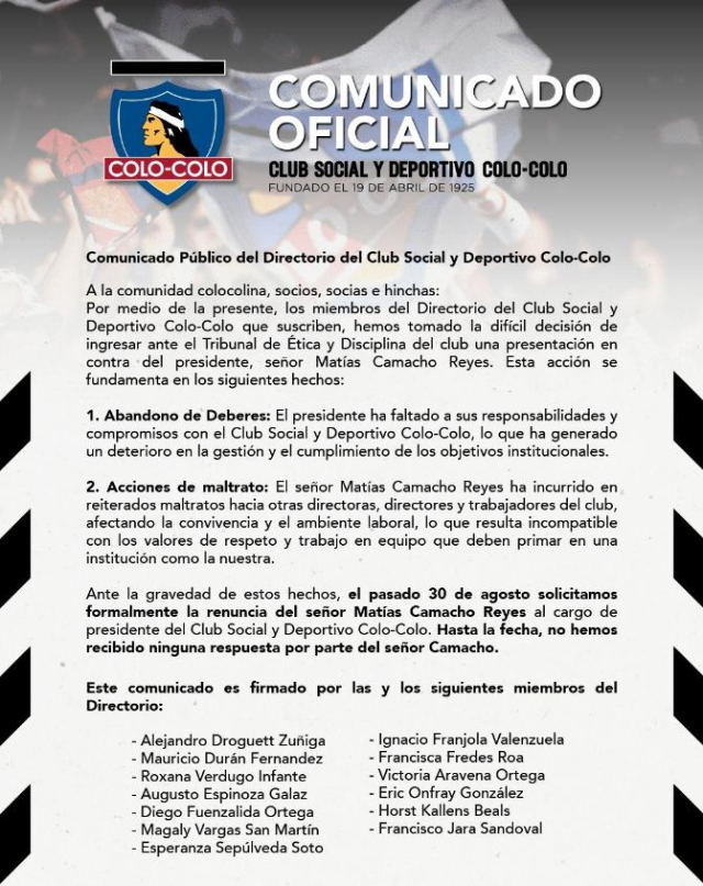 "Ante la gravedad de estos hechos, el pasado 30 de agosto solicitamos formalmente la renuncia del señor Matías Camacho Reyes al cargo de presidente del Club Social y Deportivo Colo Colo. Hasta la fecha, no hemos recibido ninguna respuesta por parte del señor Camacho", finalizó el club.
