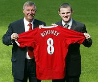 Wayne Rooney posa junto a su nuevo técnico Alex Ferguson, en su presentación oficial como delantero de Manchester United. (Foto: EFE)