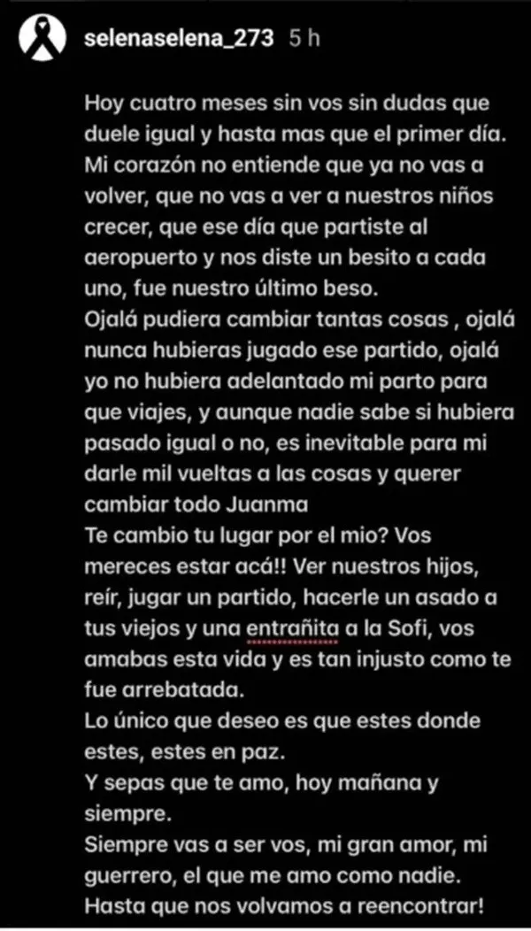 Tras ello, añadió: "Ojalá pudiera cambiar tantas cosas. Ojalá nunca hubieras jugado ese partido. Ojalá yo no hubiera adelantado mi parto para que viajaras. Y, aunque nadie sabe si hubiera pasado igual o no, es inevitable para mí darles mil vueltas a las cosas y querer cambiar todo, Juanma".