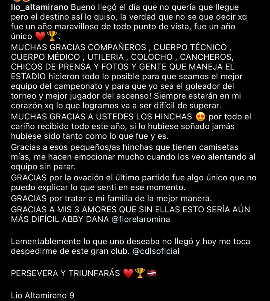 El goleador en el ascenso de Deportes La Serena, Lionel Altamirano, anunció su salida del club durante este domingo después de utilizar sus redes sociales para escribir un sentido mensaje de despedida después de la temporada que los consagró en Primera B.