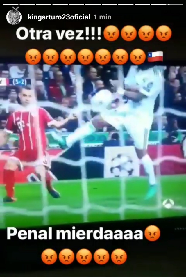 Bayern Munich quedó eliminando en una reñida clasificatoria contra Real Madrid en las semifinales de la Champions y durante el choque de revancha, que se jugó en España, el chileno Arturo Vidal, lesionado volante de los bávaros, estuvo muy activo y lanzó dardos contra el arbitraje y los "merengues".