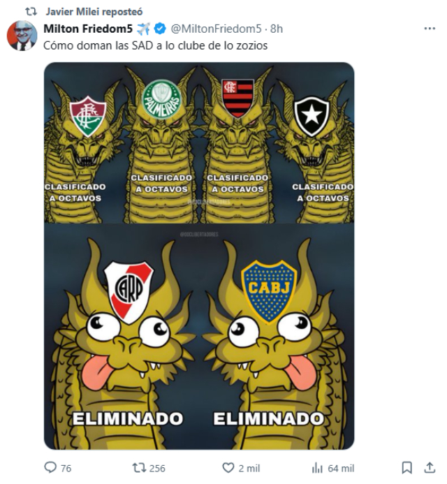 En su cuenta de X, en tanto, Milei replicó varias críticas, incluyendo una que destacaba "cómo doman las SAD", con una imagen de los cuatro equipos de Brasil.