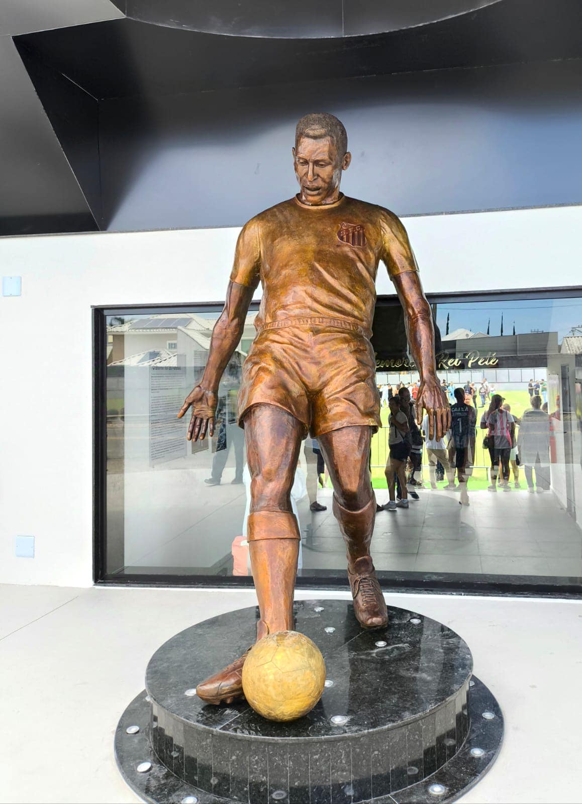 La efigie fue colocada en la entrada principal y muestra a estatua de Pelé jugando por Santos. La comentada obra mide tres metros, pesa 400 kg y está chapada en bronce.