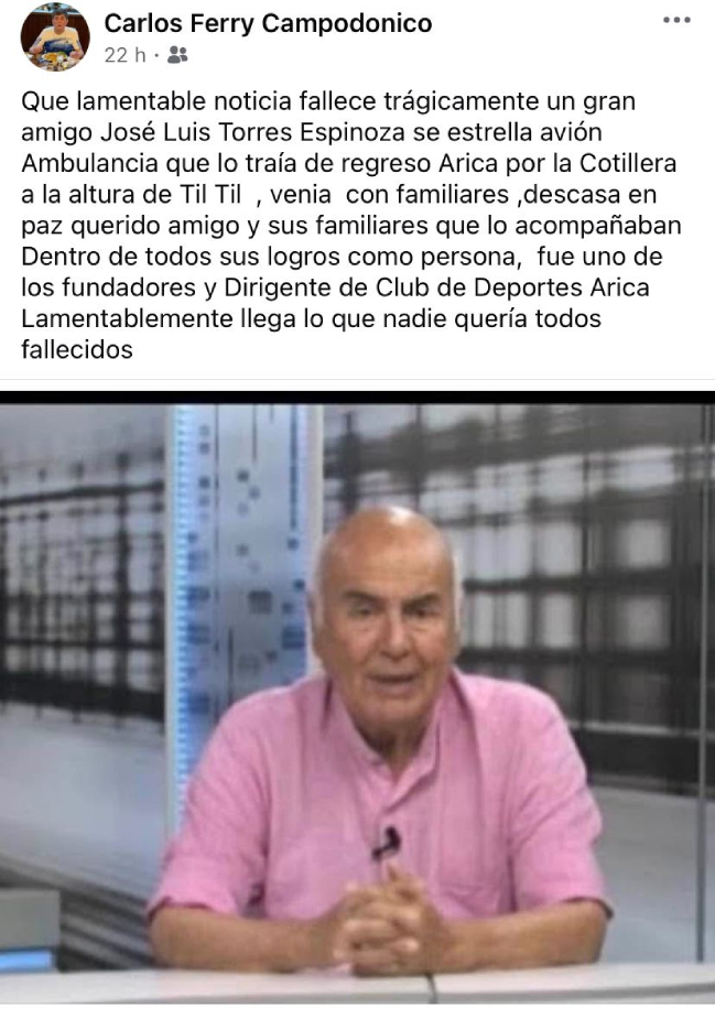 Carlos Ferry, expresidente de San Marcos de Arica, lamentó en sus redes sociales el fallecimiento del empresario José Luis Torres Espinoza, uno de los fundadores del club Deportes Arica, víctima en el trágico accidente de un avión ambulancia en Curacaví.