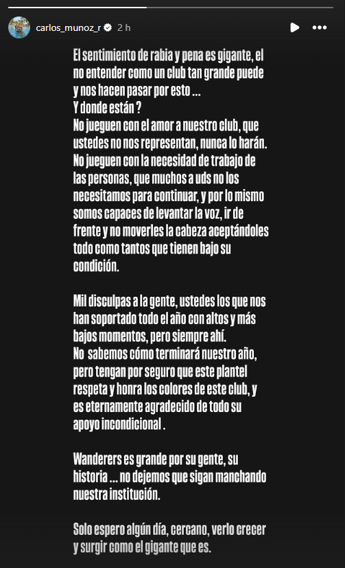 Finalmente, su mensaje fue cerrado con un: "Wanderers es grande por su gente, su historia. No dejemos que sigan manchando nuestra institución. Solo espero algún día, cercano, verlo crecer y surgir como el gigante que es".