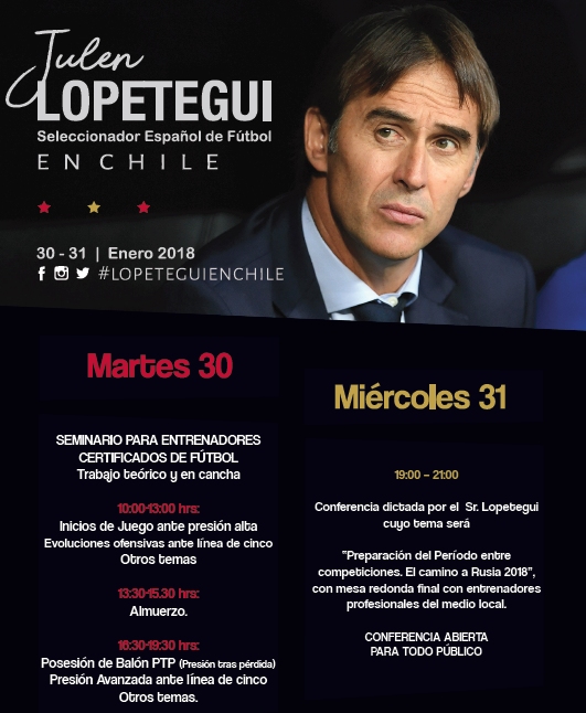 Julen Lopetegui, entrenador de la selección española de fútbol visitará Chile los próximos 30 y 31 de enero llevando a cabo un seminario para entrenadores profesionales y una charla para público.