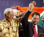 ![]() El ex mandatario Nelson Mandela y el presidente del comité de la candidatura de Sudáfrica, Danny Jordaan, celebran en Suiza la decisión de la FIFA. (Foto: EFE) |