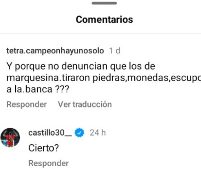 Y en otro comentario, otro hincha reclamó porque la UC no denunció a los azules por los proyectiles que tiraron a la banca y Castillo otra vez se hizo notar con un cuestionamiento: "¿Cierto?".