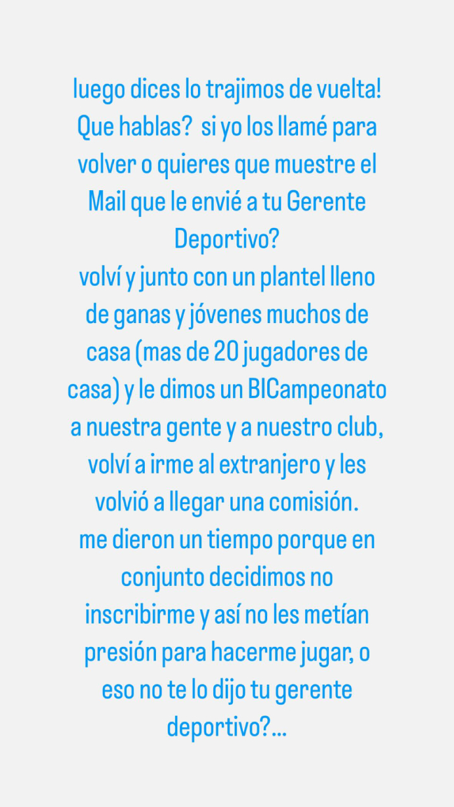 En su relato, Castillo recordó las veces que el club logró millonarias ganacias por la venta de su pase, apuntó que todos sus regresos al equipo no fueron gestionados por la dirigencia. "Volví y con un plantel lleno de ganas y jóvenes, muchos de casa, y le dimos un bicampeonato a nuestra gente y club. Me fui otra vez al extranjero y ahí llegó otra comisión".