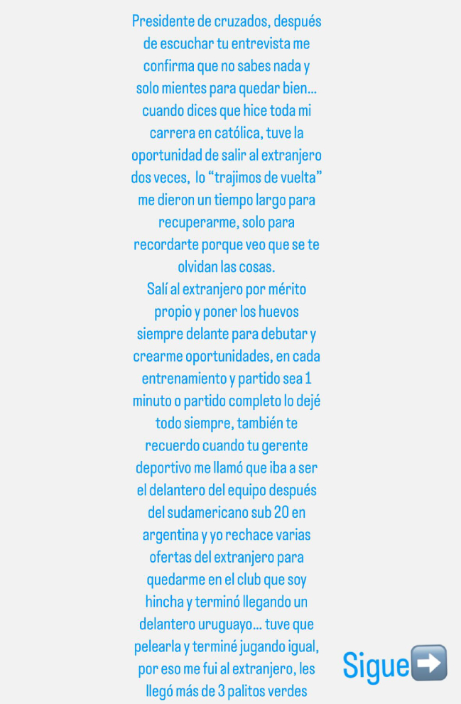 En sus historias de Instagram, Castillo disparó: "Presidente de Cruzados, después de escuchar tu entrevista me confirmo que no sabes nada y sólo mientes para quedar bien".